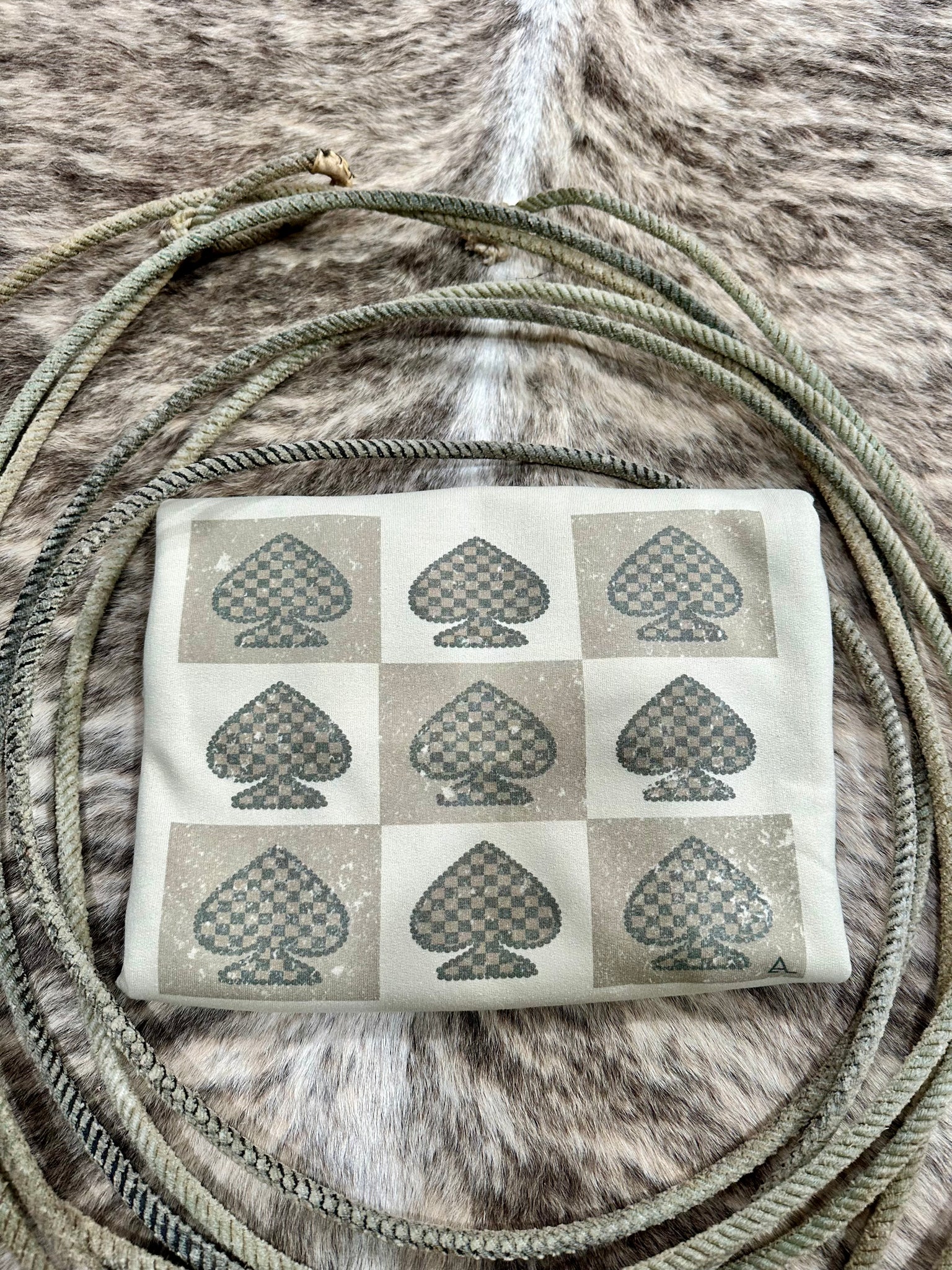 A statement piece that still goes with everything — this tan crewneck sweatshirt features a bold checkered spade design that’s equal parts edgy and neutral.
