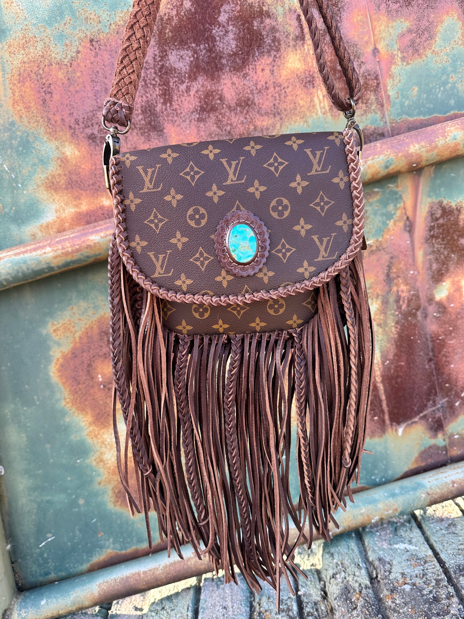 Authentic Louis Vuitton bag given a western look! Featuring a beautiful natural turquoise stone. Has an adjustable strap.